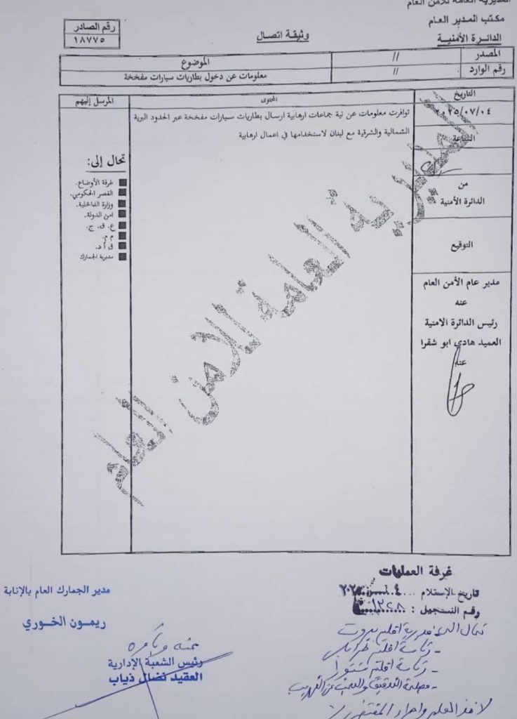 وجاء في نصّ الوثيقة: “توافرت معلومات عن نية جماعات إرهابية إرسال بطاريات مفخخة عبر الحدود البرية الشمالية والشرقية مع لبنان لاستخدامها في أعمال إرهابية”.
