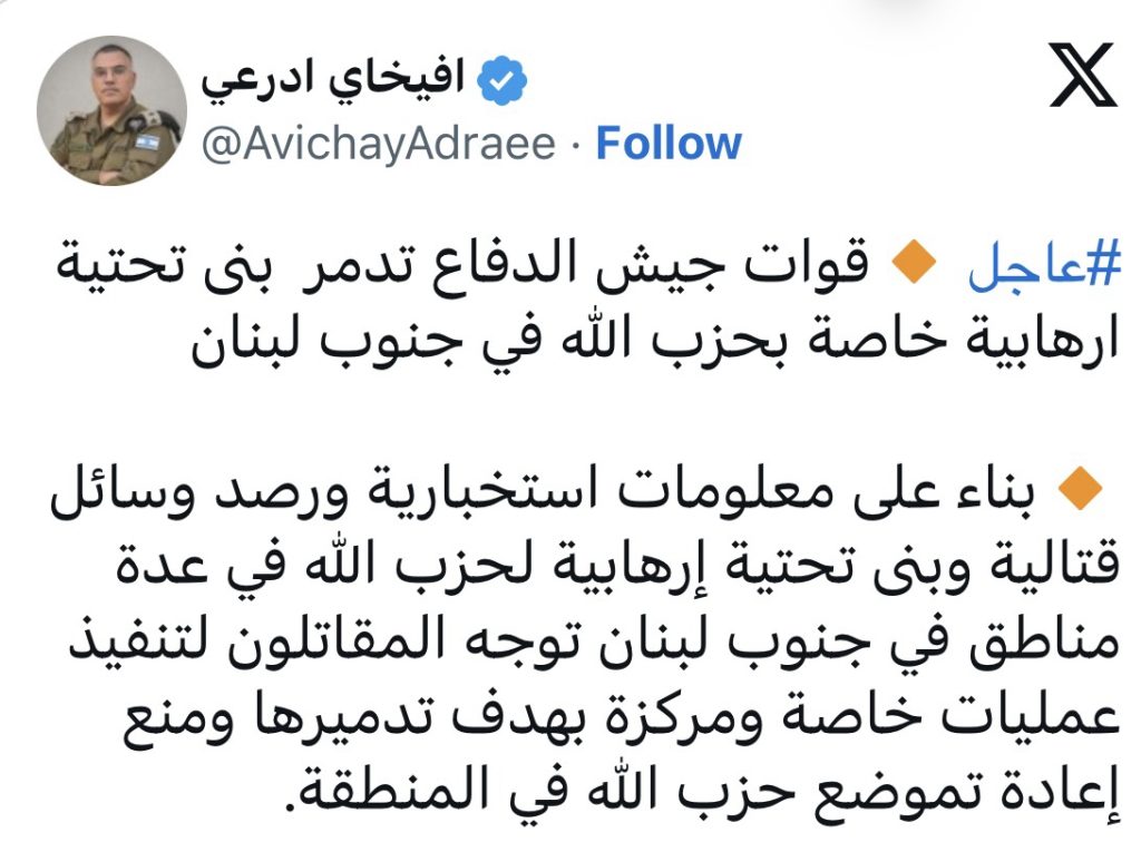 نشر المتحدث باسم الجيش الإسرائيلي أفيخي أدرعي عبر حسابه على أكس أنه بناء على معلومات استخبارية ورصد وسائل قتالية وبنى تحتية إرهابية لحزب الله في عدة مناطق في جنوب لبنان توجه المقاتلون لتنفيذ عمليات خاصة ومركزة بهدف تدميرها ومنع إعادة تموضع حزب الله في المنطقة.