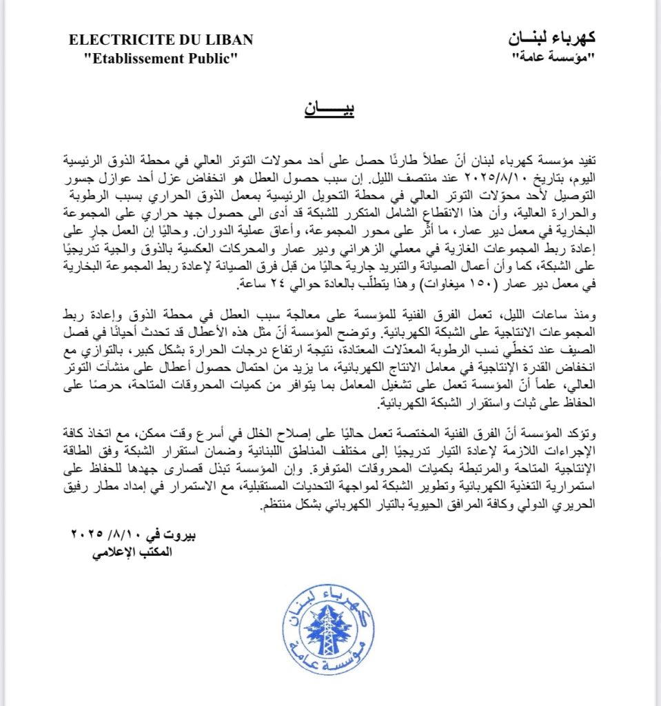 اخبار محليةعلى مدار الساعة بعد الانقطاع الطويل لكهرباء لبنان توضيح من الشركة أغسطس 10, 2025 0 162 FacebookTwitterWhatsApp