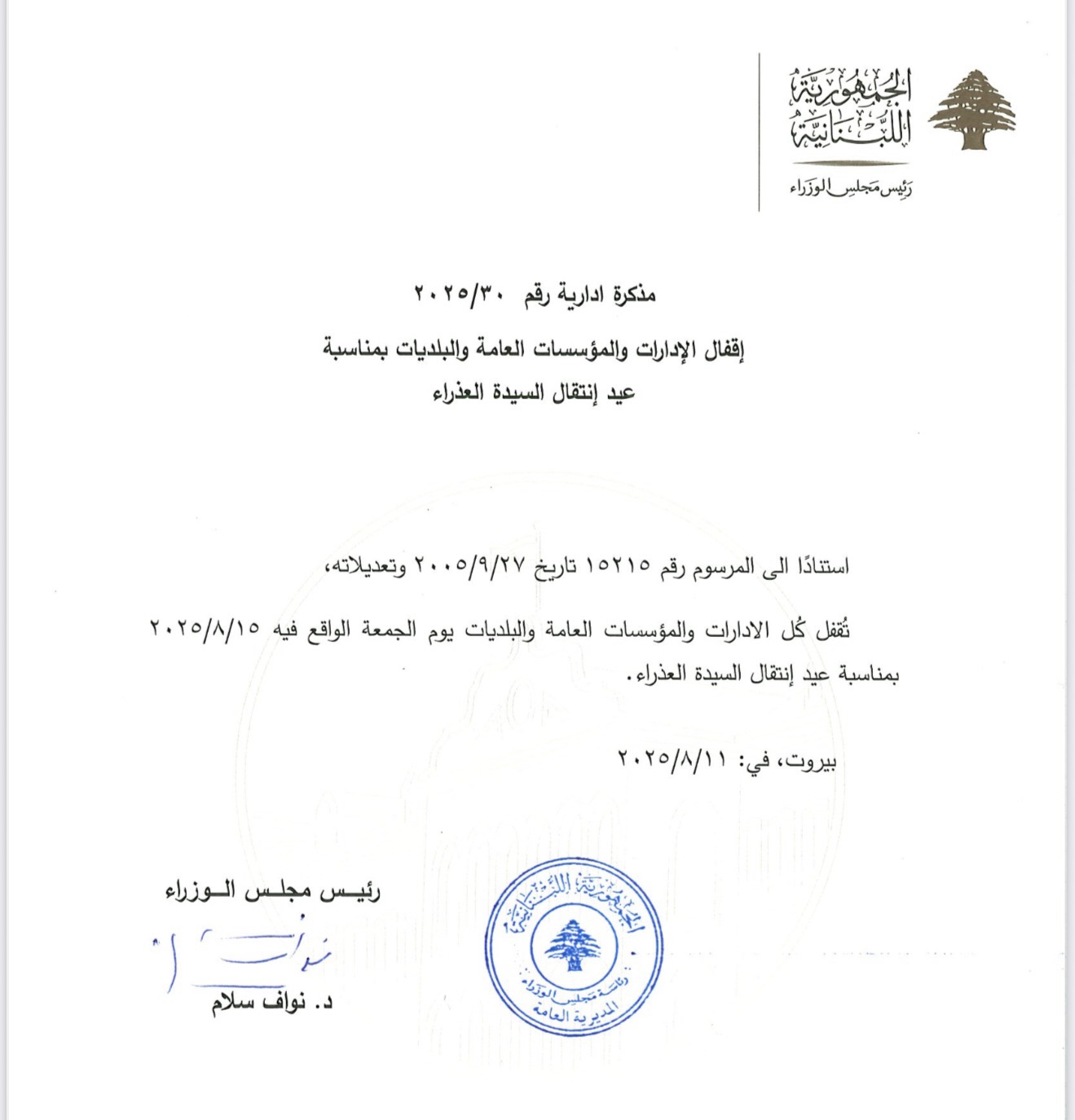 اخبار محليةعلى مدار الساعة *بالصورة: مذكرة تعطيل في عيد انتقال السيدة العذراء* أغسطس 11, 2025 0 98 FacebookTwitterWhatsApp