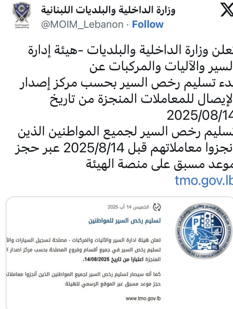 أعلنت وزارة الداخلية والبلديات – هيئة إدارة السير والآليات والمركبات عن بدء تسليم رخص السير بحسب مركز إصدار الإيصال للمعاملات المنجزة من تاريخ 2025/08/14. كذلك، سيتمّ تسليم رخص السير لجميع المواطنين الذين أنجزوا معاملاتهم قبل 2025/8/14 عبر حجز موعد مسبق على منصة الهيئة.
