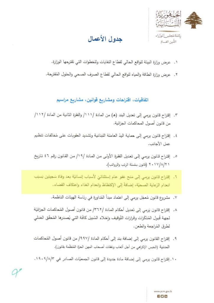 رفض مجلس الوزراء بالإجماع في جلسته التي عقدت في السراي الحكومي أمس، إقرار البند السادس المتعلّق بـ«منح عفو عام استثنائي لأسباب إنسانية، بعد وفاة سجينين، بسبب انعدام الرعاية الصحية، إضافةً إلى الاكتظاظ وانعدام الغذاء واعتكاف القضاء».
