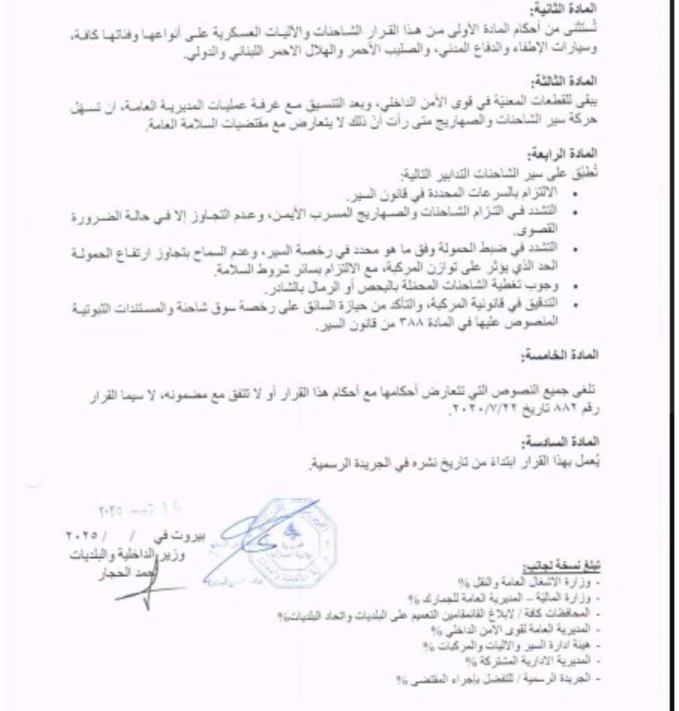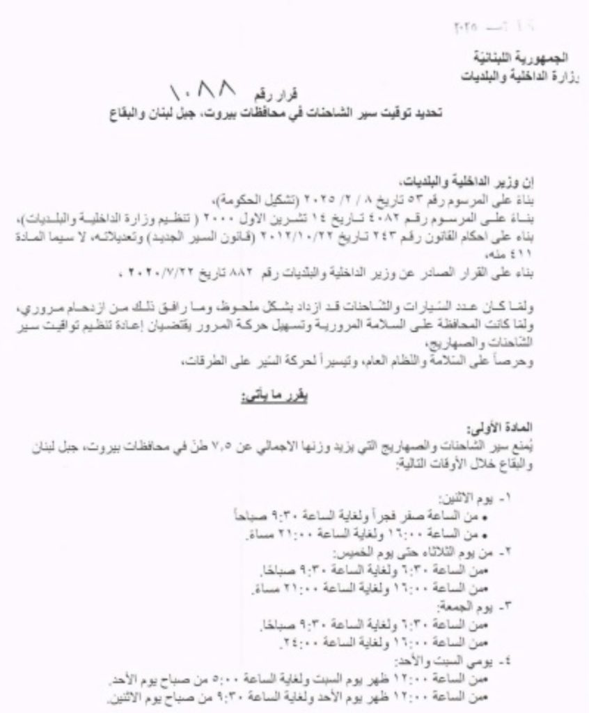 على مدار الساعةمتفرقات *وزارة الداخلية تحدد توقيت وتدابير سير الشاحنات في بيروت وجبل لبنان والبقاع (مرفق بالصور)* أغسطس 19, 2025 0 112 FacebookTwitterWhatsApp نشرت وزارة الداخلية والبلديات قرار تحديد توقيت وتدابير سير الشاحنات في محافظات بيروت، جبل لبنان والبقاع.