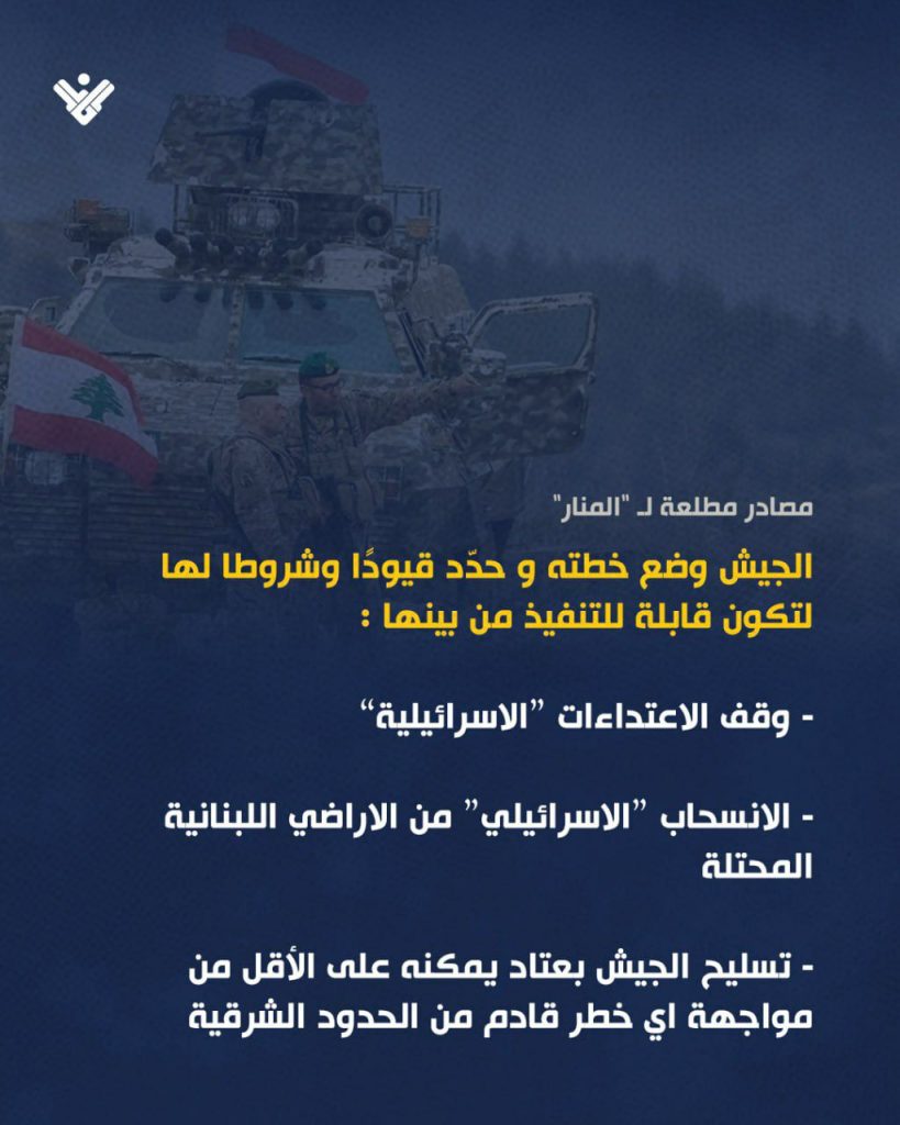 اخبار محليةعلى مدار الساعة مصادر مطلعة لـ “المنار”الجيش وضع خطته! أغسطس 20, 2025 0 98 FacebookTwitterWhatsApp الجيش وضع خطته و حدّد قيودًا وشروطا لها لتكون قابلة للتنفيذ من بينها