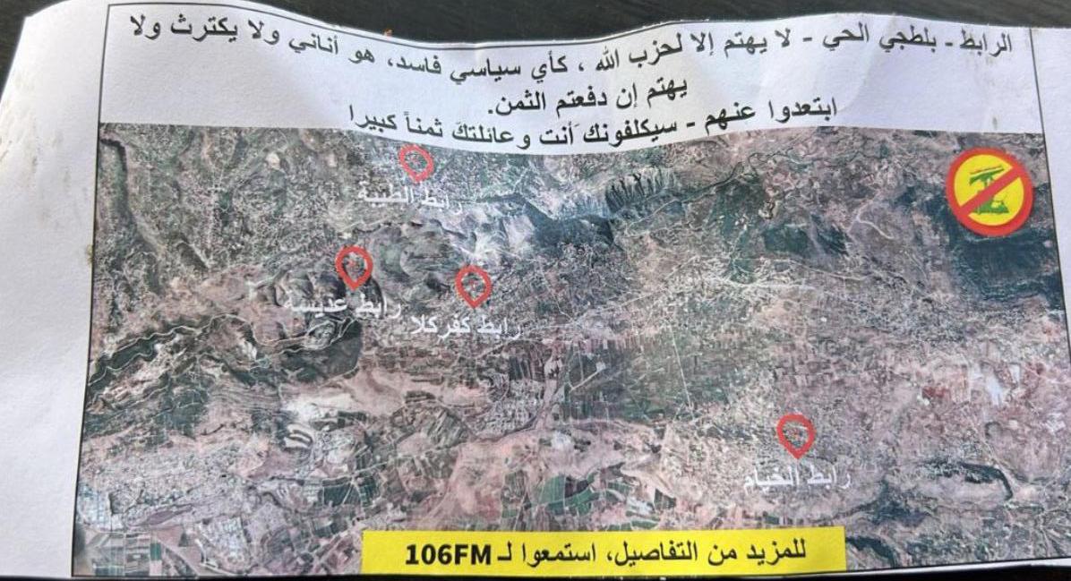 اخبار محليةعلى مدار الساعة درون اسرائيلية تلقي منشورات تحريضية ضد الحزب ! أغسطس 27, 2025 0 135 FacebookTwitterWhatsApp ألقت درون اسرائيلية في بلدة عديسة منشورات تحريضية ضد مسؤولين بالحزب في بلدات عديسة كفركلا الطيبة والخيام جنوب لبنان