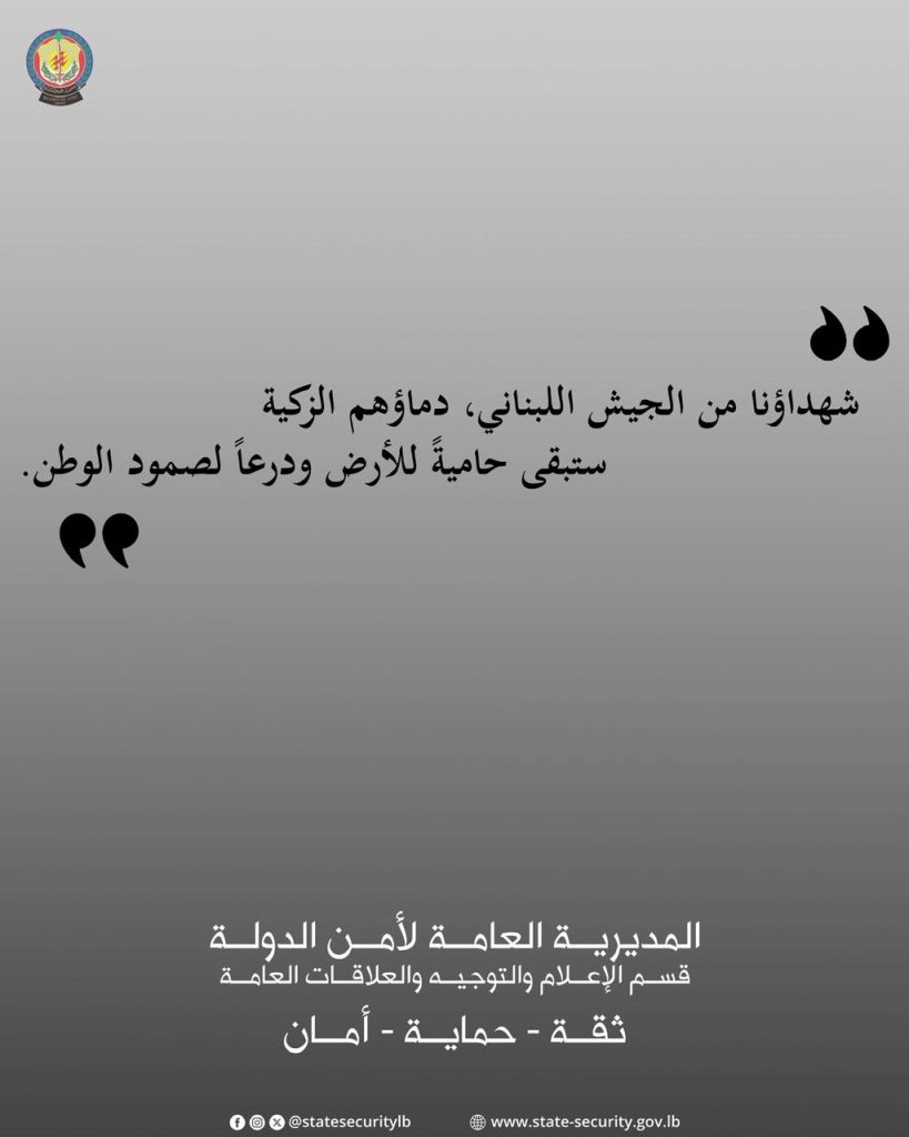 “بعد استشهاد ضابط ومعاون في الجيش اللبناني جراء الانفجار الذي وقع في الناقورة جنوب لبنان أثناء الكشف على مسيّرة تابعة للعدو الإسرائيلي ، نشرت المديرية العامة لأمن الدولة عبر منصاتها الرسمية صورة نعي، مؤكدة أنّ شهداؤنا من الجيش اللبناني، دماؤهم الزكية ستبقى حامية للأرض ودرعاً لصمود الوطن.