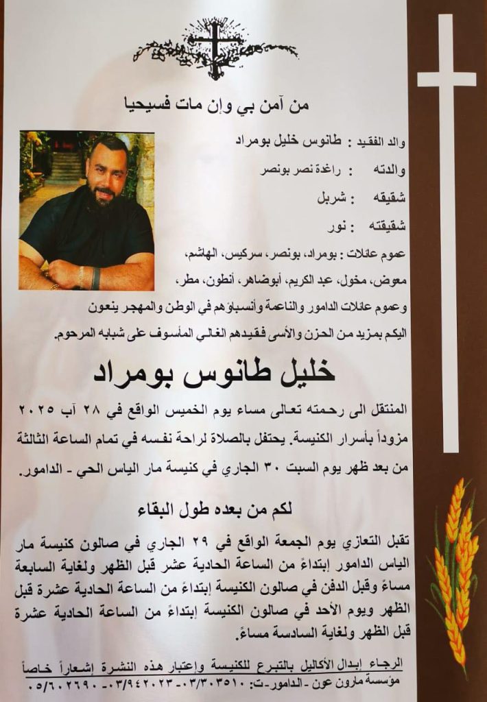 بمزيد من الحزن والأسى، وبقلب يملؤه الرجاء بالقيامة تنعي بلدية الدامور رئيسًا وأعضاءً ابن البلدة الشاب خليل بو مراد الذي قضى ضحية جريمة شنيعة طالت حياته ظلمًا وعدوانًا.