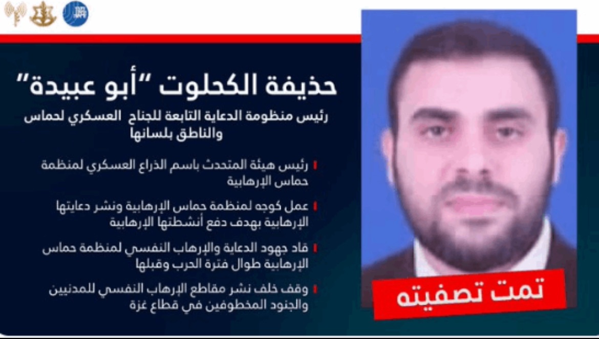 افيخاي ادرعي عبر اكس : جيش الدفاع والشاباك يقضيان على قائد منظومة الدعاية في الجناح العسكري لحماس المدعو حذيفة الكحلوت المسمى أبو عبيدة