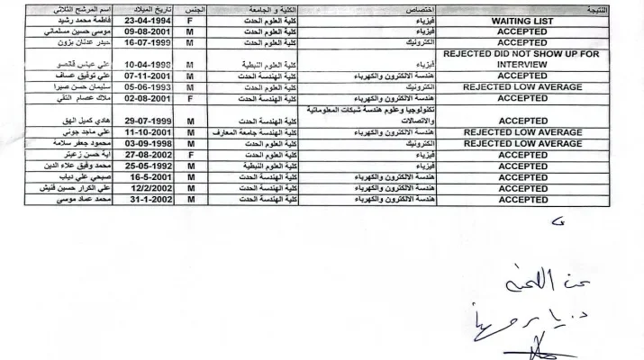 وعرض كنج لـ”المدن” اللائحة الرسمية للطلاب الذين تقدموا بطلبات للانضمام لهذا الماستر، وتبين أن عددهم 15 طالباً جميعهم من الطائفة الشيعية. طالبان منهما لم يحضرا لإجراء المقابلة فاستُبعدا، وطالبان معدل نجاحهما دون المستوى المطلوب، أما الطالب الخامس فهو على لائحة الانتظار. وبالتالي جرى قبول عشرة طلاب من أصل الـخمسة عشر.