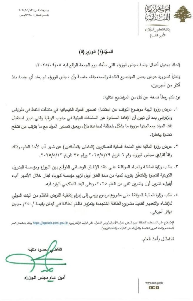وزعت الامانة العامة لمجلس الوزراء ملحقا بجدول أعمال جلسة مجلس الوزراء التي ستعقد يوم الجمعة الواقع فيه 202 5/09/05، وذلك نظرا لعدم انعقاد مجلس الوزراء لاكثر من اسبوعين.