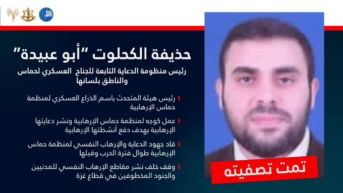 وأوضح أدرعي أنّ الكحلوت قُضي عليه السبت الماضي خلال عملية مشتركة، لافتًا إلى أنّه كان يعدّ “الوجه الإعلامي” للحركة والمسؤول عن جهود الدعاية والحرب النفسية.