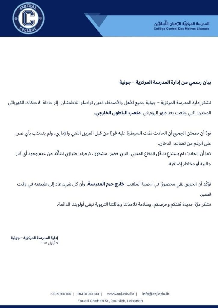 على مدار الساعةمتفرقات بيان صادر عن ادارة مدرسة #المركزية بعد الحريق اليوم سبتمبر 9, 2025 0 76 FacebookTwitterWhatsApp
