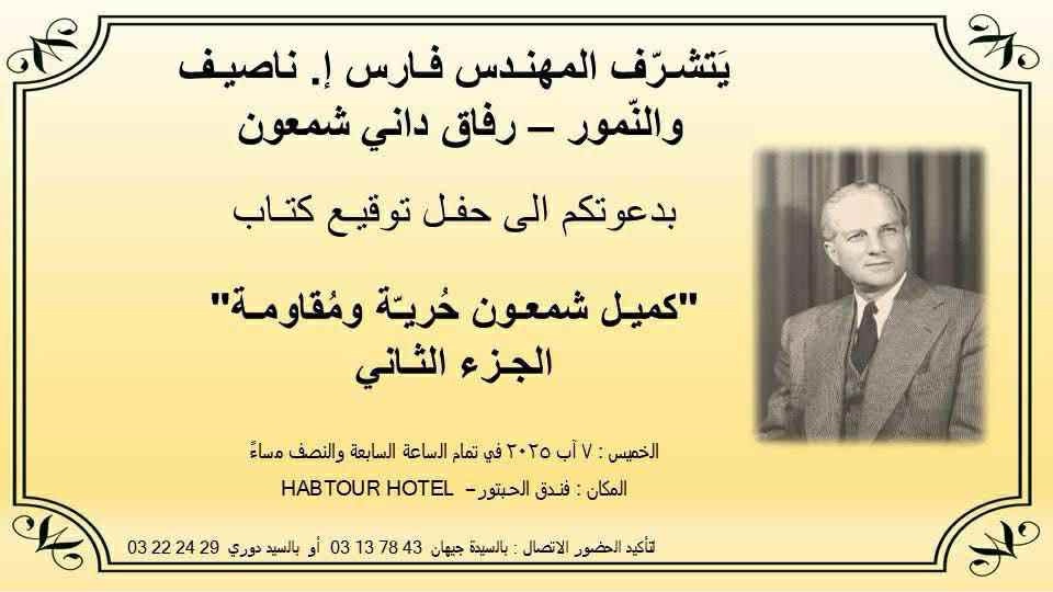 صدر قبل أيام الجزء الثاني من كتاب “كميل شمعون: حريّة ومقاومة” للمهندس فارس ناصيف، عن “دار سائر المشرق”، ويتناول سيرة الرئيس الثاني للجمهورية بعد الاستقلال بين نهاية عهده الرئاسي سنة 1958 ووفاته سنة 1987، بعدما تطرّق الجزء الأول إلى مسيرته السياسيّة منذ ولادته وحتى أحداث ما عُرف باسم “ثورة 1958″. تستند هذه السيرة إلى ما صدر عن الرئيس شمعون من مؤلَّفات وما أفرجت عنه الدوائر الأميركية من وثائق سرّية عن تلك المرحلة، وبخاصة وزارة الخارجية و”وكالة الاستخبارات المركزية”.