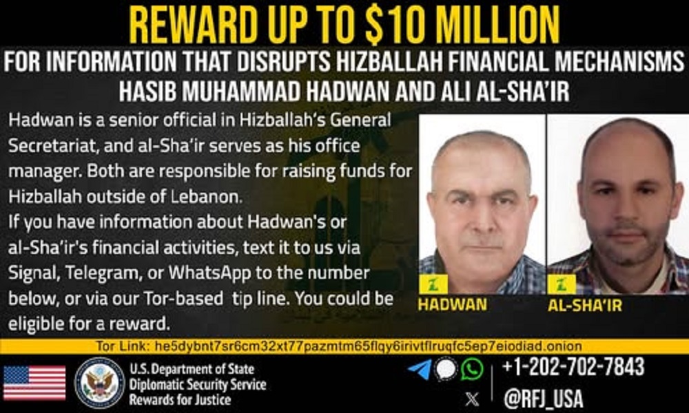 كما أكّد البرنامج أنّ أي شخص يمتلك معلومات حول الأنشطة المالية “لحدوان” أو “الشاعر”، يمكنه التواصل عبر القنوات المخصصة للبرنامج، بما قد يؤهله للحصول على مكافأة تصل إلى 10 ملايين دولار.
