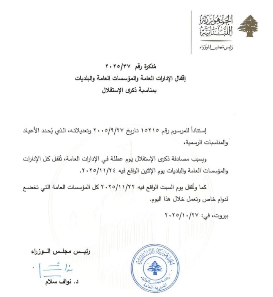 أصدر رئيس مجلس الوزراء نواف سلام، مذكرة بإقفال الادارات العامة والمؤسسات العامة والبلديات، بمناسبة زيارة قداسة الحبر الاعظم إلى لبنان.كما أصدر سلام مذكرة بإقفال الادارات العامة والمؤسسات العامة والبلديات بمناسبة ذكرى الاستقلال.