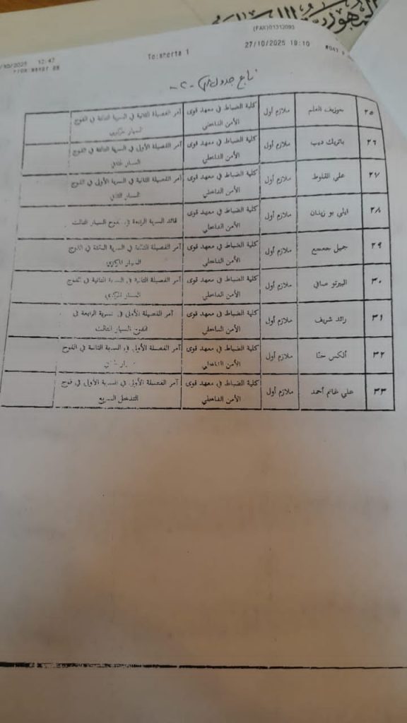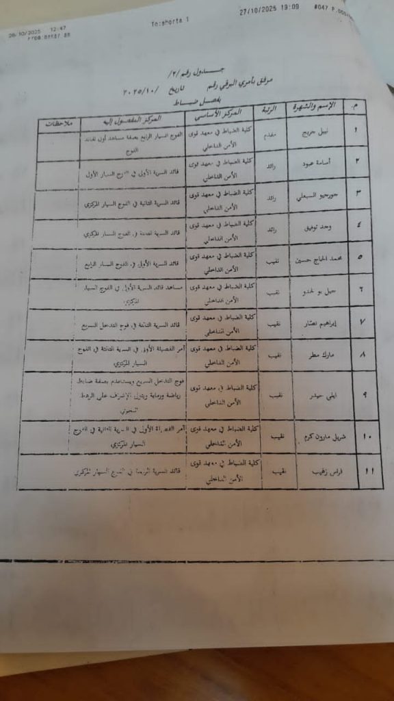 اخبار محليةعلى مدار الساعة تشكيلات جديدة في قوى الأمن تطال 33 ضابط… أكتوبر 28, 2025 0 101 FacebookTwitterWhatsApp أصدرت المديرية العامة لقوى الأمن الداخلي قراراً بتشكيلات جديدة شملت نقل وتعيين 33 ضابطاً في مراكز مختلفة
