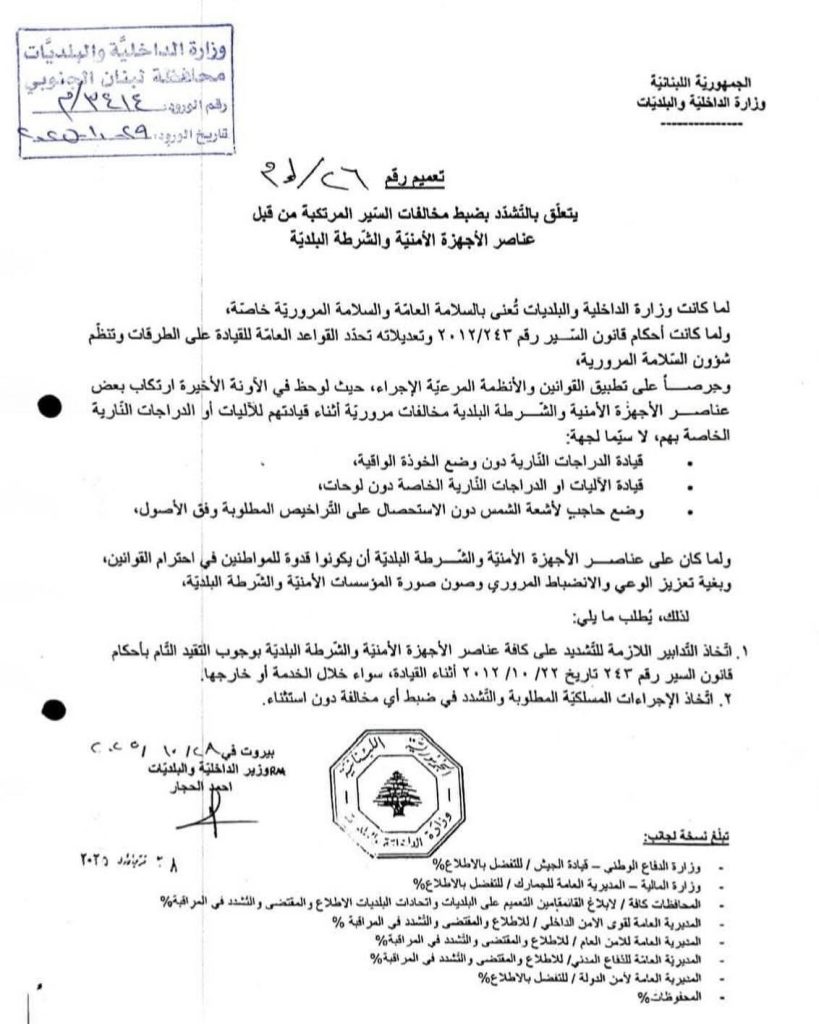 الى ذلك افادت المعلومات، عن حملة شاملة في كافة المناطق اللبنانية تشمُل ضوابط مالية بحق المخالفين والحجز الفوري لكُل شخص لا يملك رخصة فيميه او رخصة سواقة (دراجة نارية او سيارة)