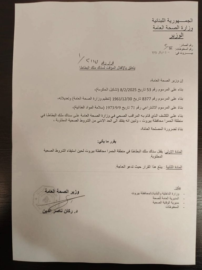 اخبار محليةعلى مدار الساعة اقفال ملك البطاطا في الحمرا نوفمبر 6, 2025 0 93 FacebookTwitterWhatsApp قررت وزارة الصحة إقفال سناك ملك البطاطا في الحمرا، لحين استيفاء الشروط الصحية المطلوبة.