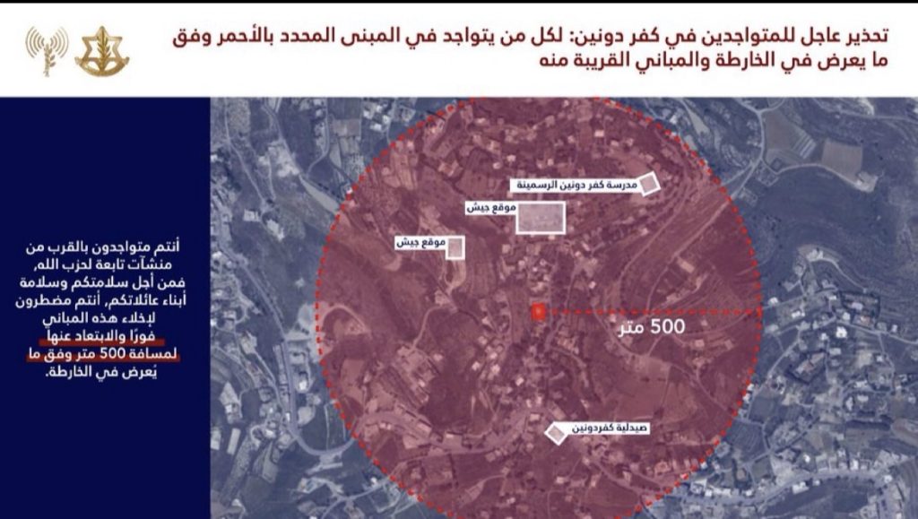 🔸نتوجه إلى سكان المبنى المحدد بالأحمر في الخريطة المرفقة والمباني المجاورة له: أنتم تتواجدون بالقرب من مبنى يستخدمه حزب الله الإرهابي فمن أجل سلامتكم أنتم مضطرون لإخلاء المباني فورًا والابتعاد عنها لمسافة لا تقل عن 500 متر