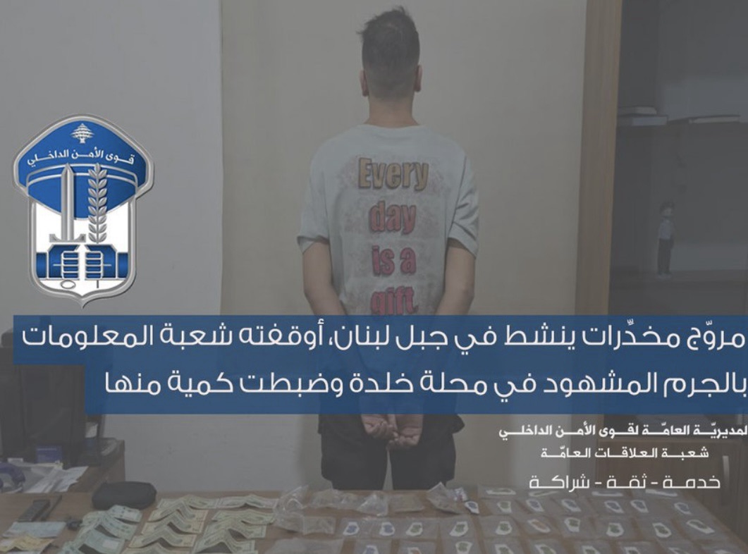 في إطار المتابعة المستمرة التي تقوم بها قوى الأمن الدّاخلي للحد من تجارة وترويج المخدرات في مختلف المناطق اللبنانية، توافرت معطيات لشعبة المعلومات حول قيام شخص مجهول بترويج المخدرات في مناطق جبل لبنان.