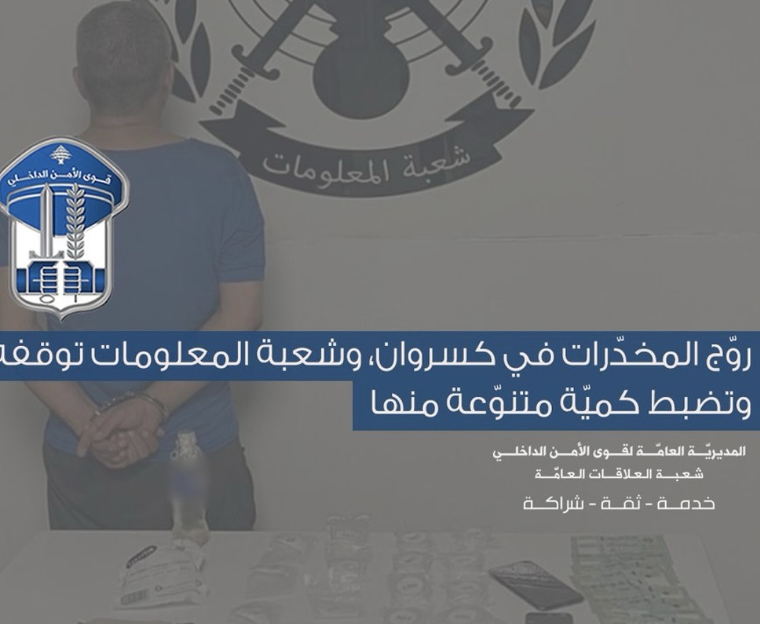 تمكنت إحدى دوريات شعبة المعلومات، من تحديد مكان شخص مجهول يروّج المخدرات في مناطق كسروان حيث أوقفته بالجرم المشهود، في محلة زوق مصبح أثناء قيامه بترويج المخدرات على متن سيارته من نوع كيا.