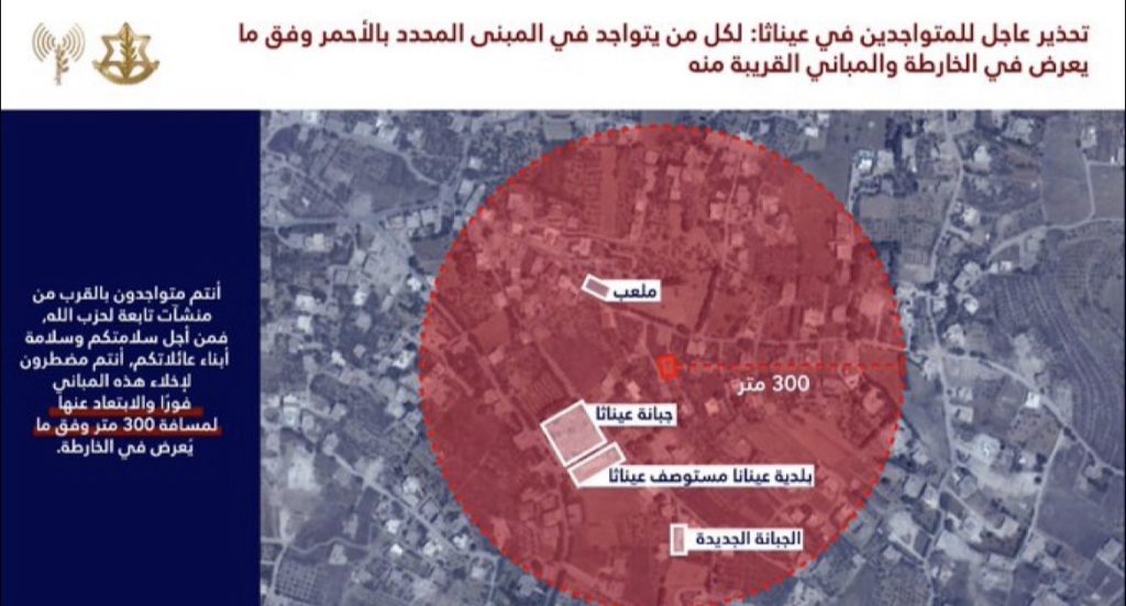 🔸أنتم تتواجدون بالقرب من مباني يستخدمها حزب الله ومن أجل سلامتكم أنتم مضطرون لإخلائها فورًا والابتعاد عنها لمسافة لا تقل عن 300 متر