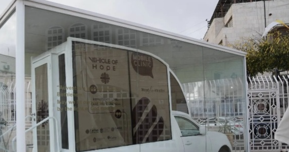 والسيارة من نوع ميتسوبيشي وهي هدية من الرئيس الفلسطيني محمود عباس، وقد سلّمت للرهبان الفرنسيسكان بعد تحويلها إلى عيادة متنقلة.