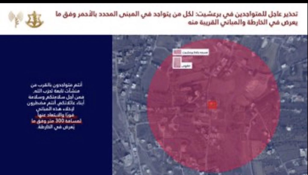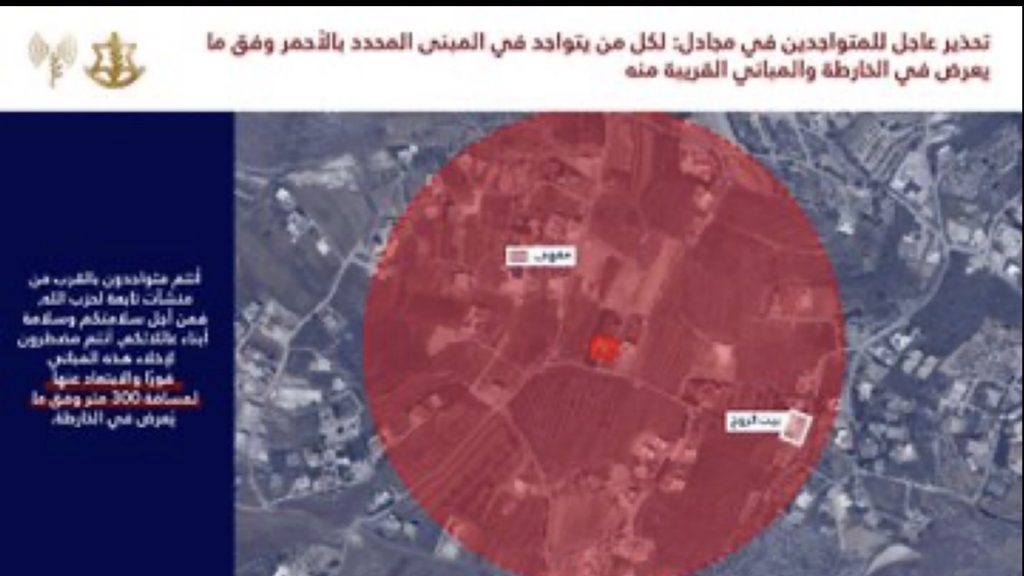 🔸أنتم تتواجدون بالقرب من مباني يستخدمها حزب الله ومن أجل سلامتكم أنتم مضطرون لإخلائها فورًا والابتعاد عنها لمسافة لا تقل عن 300 متر