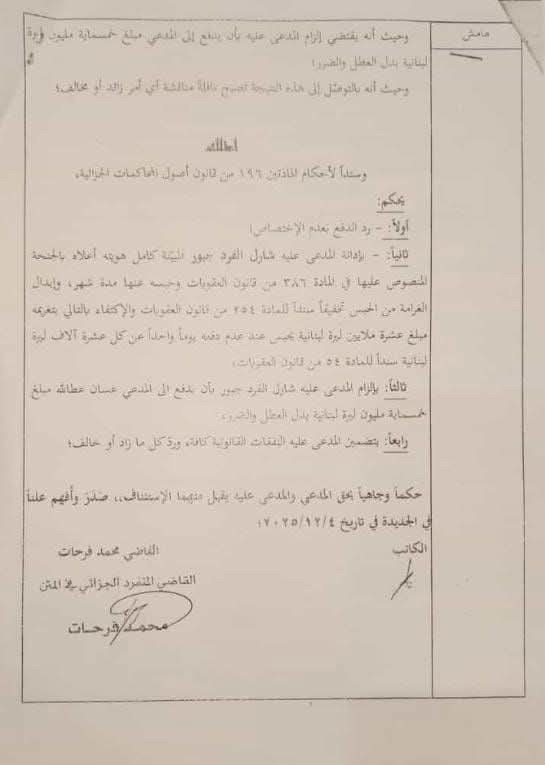وقضى القرار بإلزامه بدفع غرامة و تعويض بقيمة خمسماية مليون ل.ل كعطل وضرر.