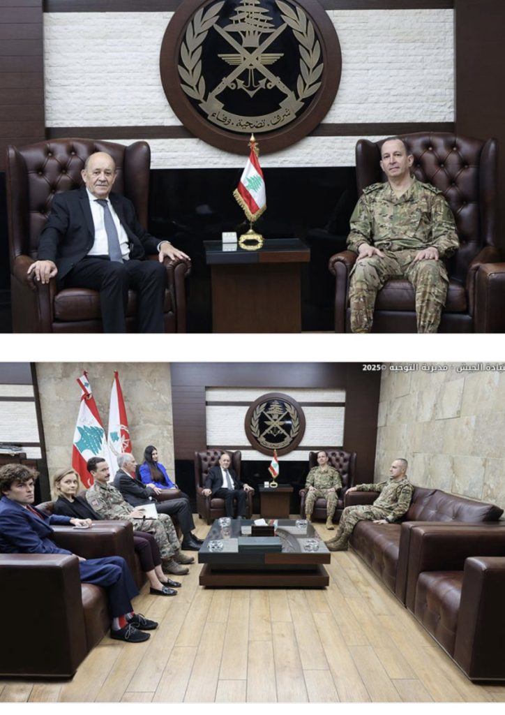 استقبل قائد الجيش العماد رودولف هيكل في مكتبه في اليرزة المبعوث الخاص للرئيس الفرنسي إيمانويل ماكرون الوزير السابق جان إيف لودريان على رأس وفد مرافق، بحضور السفير الفرنسي في لبنان Hervé Magro وجرى عرض آخر التطورات في لبنان والمنطقة وسبل دعم الجيش في ظلّ التحديات الراهنة.
