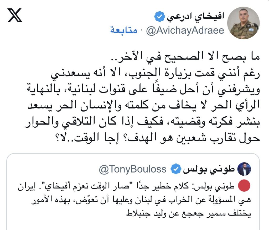 وفي رده، قال أدرعي: “ما بصحّ إلا الصحيح في الآخر.. رغم أنني قمت بزيارة الجنوب، إلا أنه يسعدني ويشرّفني أن أحلّ ضيفًا على قنوات لبنانية. بالنهاية، الرأي الحر لا يخاف من كلمته، والإنسان الحر يسعد بنشر فكرته وقضيته، فكيف إذا كان التلاقي والحوار حول تقارب شعبين هو الهدف؟ إجا الوقت… لا”
