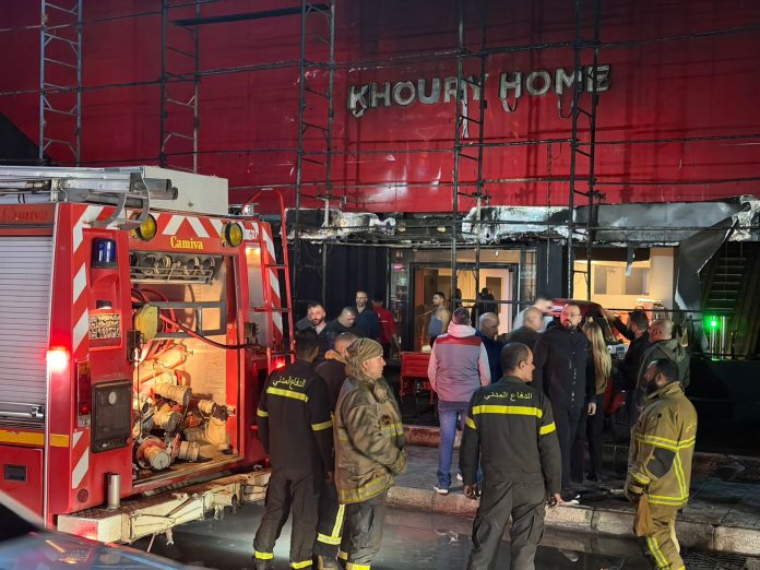أخمد عناصر الدفاع المدني النيران التي اندلعت في الواجهة الأمامية التي وضعت أمام محلات خوري هوم في منطقة الدورة كزينة للاعياد.