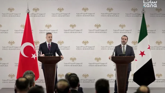 جاء ذلك خلال مؤتمر صحافي مشترك لفيدان والشيباني، اليوم الاثنين، وذلك بعد زيارة وفد تركي رفيع المستوى ضم فيدان ووزير الدفاع التركي يشار غولر ورئيس جهاز الاستخبارات إبراهيم قالن، إلى سوريا، عقد خلالها الوفد اجتماعاً مغلقاً مع الرئيس السوري أحمد الشرع ونظرائهم السوريون.