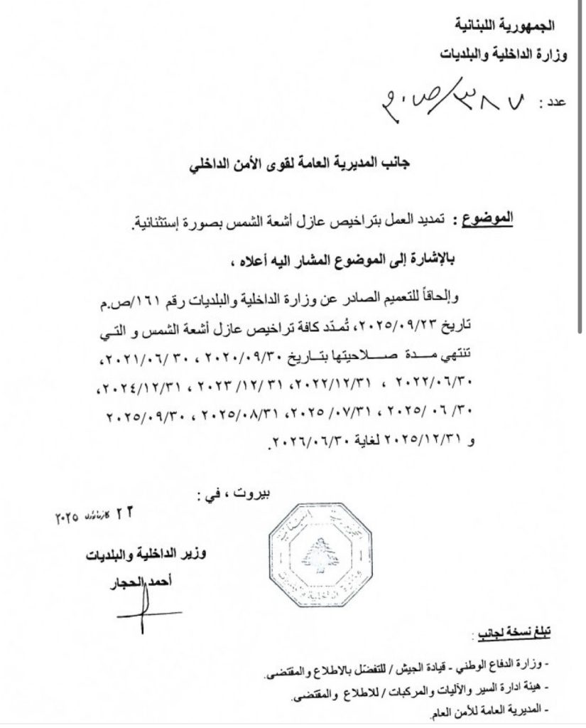 وأشار التعميم، الصادر عن وزير الداخلية والبلديات أحمد الحجار، إلى أنّه وبالإشارة إلى التعميم السابق رقم 161/ص.م. تاريخ 23/9/2020، تقرّر تمديد جميع تراخيص عازل أشعة الشمس التي تنتهي مدة صلاحيتها خلال الفترة الممتدة بين 30/9/2020 و30/6/2025، على أن تُعتبر هذه التراخيص سارية المفعول لغاية 30/6/2026.