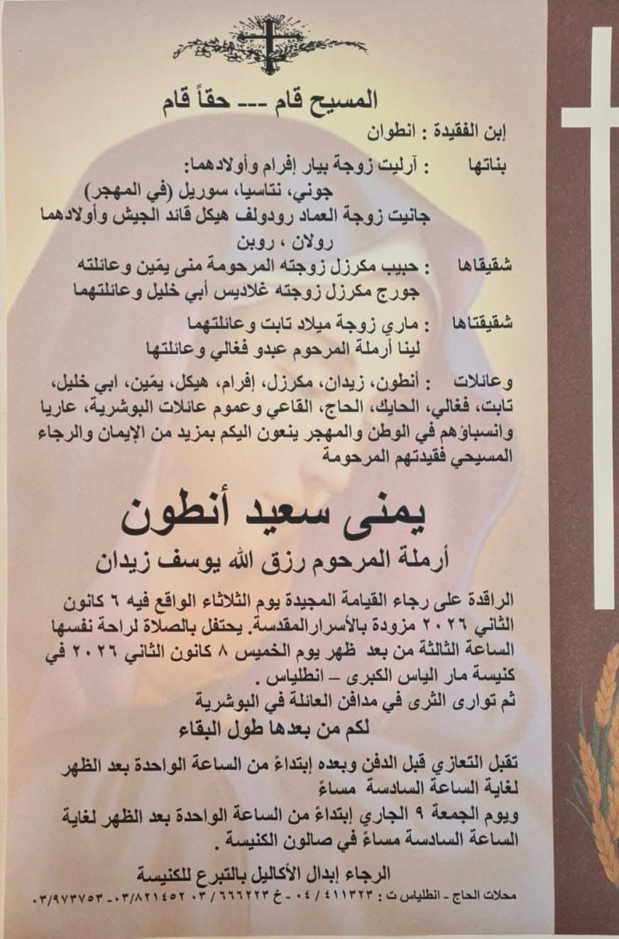 على مدار الساعةمتفرقات والدة زوجة قائد الجيش العماد رودولف هيكل في ذمة الله يناير 7, 2026 0 104 FacebookTwitterWhatsApp