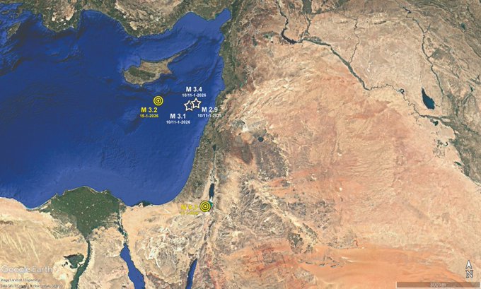 “الهزة الأرضية صباح اليوم في منطقة البحر الميت بقوة 4.3 درجات تبعتها هزة بقوة 3.2 درجات جنوب قبرص على سلسلة اللاذقية البحرية. هاتان الهزتان منفصلتان جيولوجياً عن بعضهما، ولكن فارق الوقت بينهما (أقل من دقيقتين) يرجّح أن ارتجاجات الهزة الأولى استحثت الحركة على فالق الهزة الثانية. هاتان الهزتان وتلك التي حصلت ليل السبت-الأحد (10/11-1-2026) الفائت غير مرتبطة جيولوجياً بحيث أن الضغوطات الأرضية لا يمكن أن تنتقل من منطقة الى أخرى على بعد يزيد عن 300 كلم وفي غياب فوالق متصلة مع بعضها.