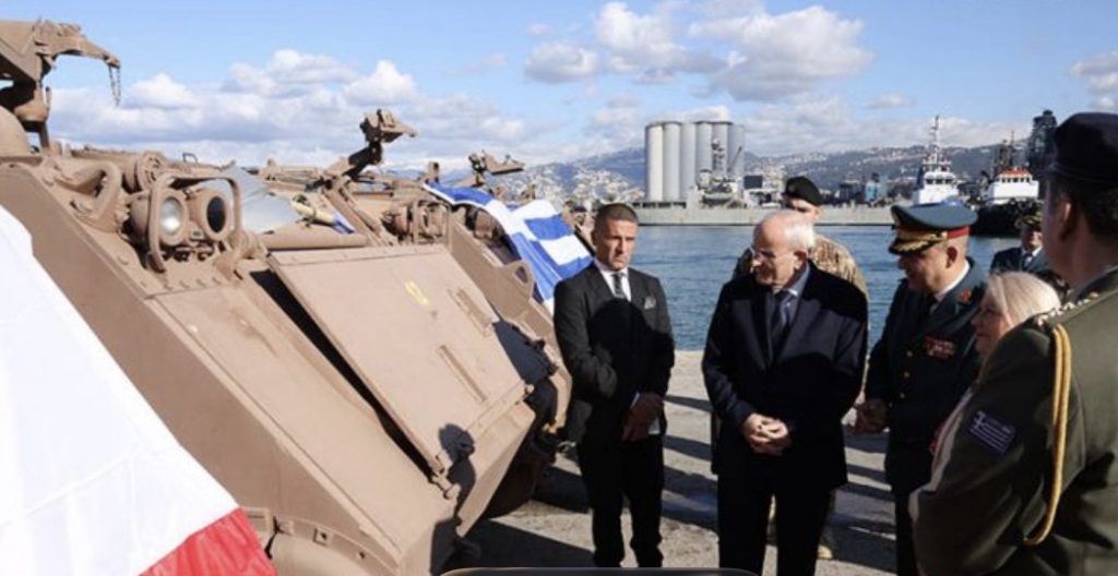 بتاريخ 15 /1 /2026، أقيم في مرفأ بيروت حفل تسلّم هبة مقدمة من قبل السلطات اليونانية للجيش، بحضور وزير الدفاع الوطني اللواء ميشال منسّى، والسفيرة اليونانية في لبنان Despina A. Koukoulopoulou، ونائب رئيس الأركان للتجهيز على رأس وفد من قيادة الجيش، إلى جانب عدد من الضباط. وتضمنت الهبة 13 ناقلة جند من نوع (M113) و10 آليات مع قطع البدل العائدة لها.