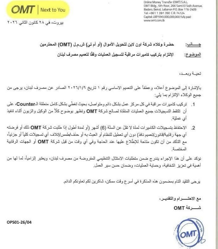 اخبار محليةعلى مدار الساعة *مصرف لبنان يصدر قرارا يلزم فيه شركات تحويل الاموال مثل (OMT) بضرورة وضع كاميرات تسجيل تظهر بوضوح الوكيل والزبون أثناء تنفيذ أي عملية تحويل الاموال والاحتفاظ بتسجيل الكاميرات لمدة لاتقل عن 6أشهر* يناير 29, 2026 0 8 FacebookTwitterWhatsApp