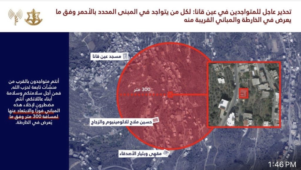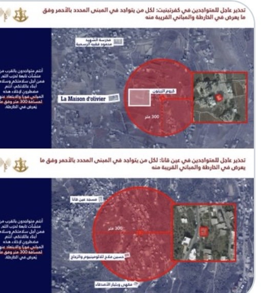 أصدر الجيش الإسرائيلي إنذار عاجل إلى سكان جنوب لبنان، ولا سيّما في بلدتي كفر تبنيت وعين قانا، محذّراً من استهداف وشيك لما وصفه ببنى تحتية عسكرية تابعة لحزب الله.