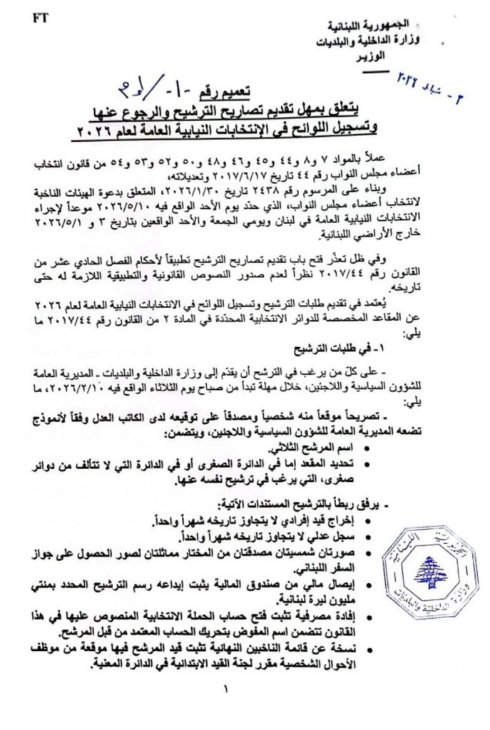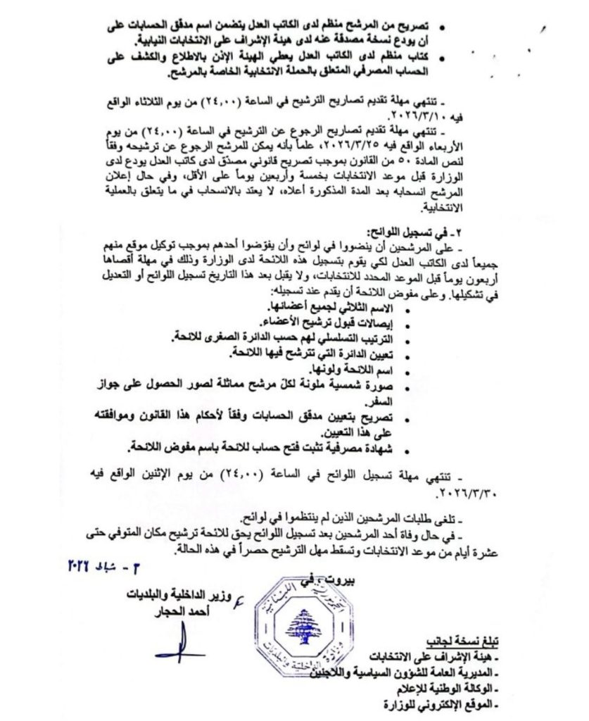 أصدر وزير الداخلية والبلديات أحمد الحجار تعميماً حدّد فيه مهل تقديم تصاريح الترشيح والرجوع عنها، وتسجيل اللوائح للانتخابات النيابية العامة لعام 2026.وبحسب التعميم، تبدأ مهلة تقديم تصاريح الترشيح لدى وزارة الداخلية والبلديات – المديرية العامة للشؤون السياسية واللاجئين، اعتباراً من صباح يوم الثلاثاء في 10 شباط 2026، وتستمر حتى الساعة 24:00 من يوم الثلاثاء 10 آذار 2026.