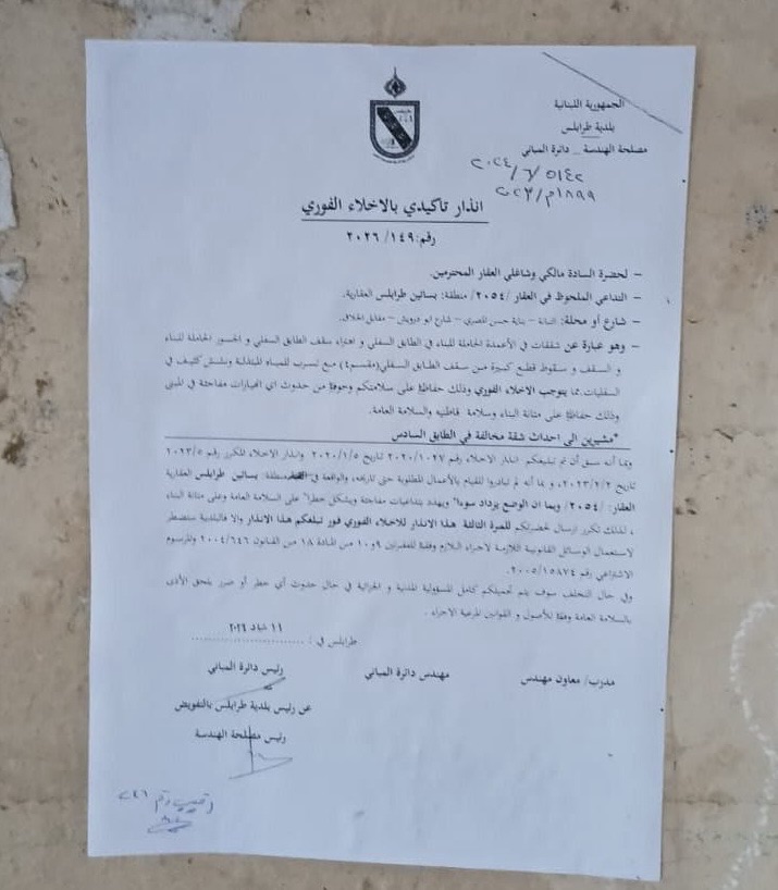 اخبار محليةعلى مدار الساعة *بلدية طرابلس اصدرت قراراً بالإخلاء الفوري لمبنى المصري في التبانة* فبراير 12, 2026 0 8 FacebookTwitterWhatsApp