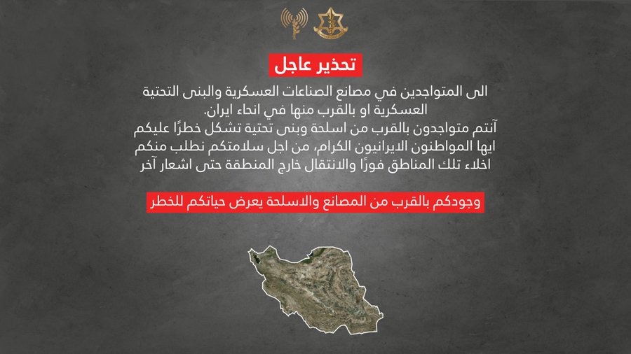 اخبار دوليةعلى مدار الساعة ادرعي ؛ انذار عاجل إلى جميع المتواجدين داخل أو بالقرب من منشآت تابعة للصناعات العسكرية الإيرانية وبنى تحتية عسكرية في أنحاء ايران. فبراير 28, 2026 0 10 FacebookTwitterWhatsApp ⭕️أنتم تتواجدون بالقرب من منشآت ومصالح خطيرة. ⭕️أيها المواطنون الإيرانيون الكرام، من أجل سلامتكم وأمنكم نطلب منكم اخلاء هذه المناطق فورًا والبقاء خارجها حتى إشعار آخر. ⭕️وجودكم في هذه المناطق يعرض حياتكم للخطر.