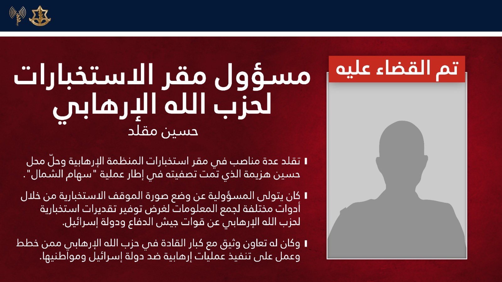 🔸هاجم جيش الدفاع الليلة الماضية في بيروت وقضى على الإرهابي المدعو حسين مقلد مسؤول مقر الاستخبارات في حزب الله.