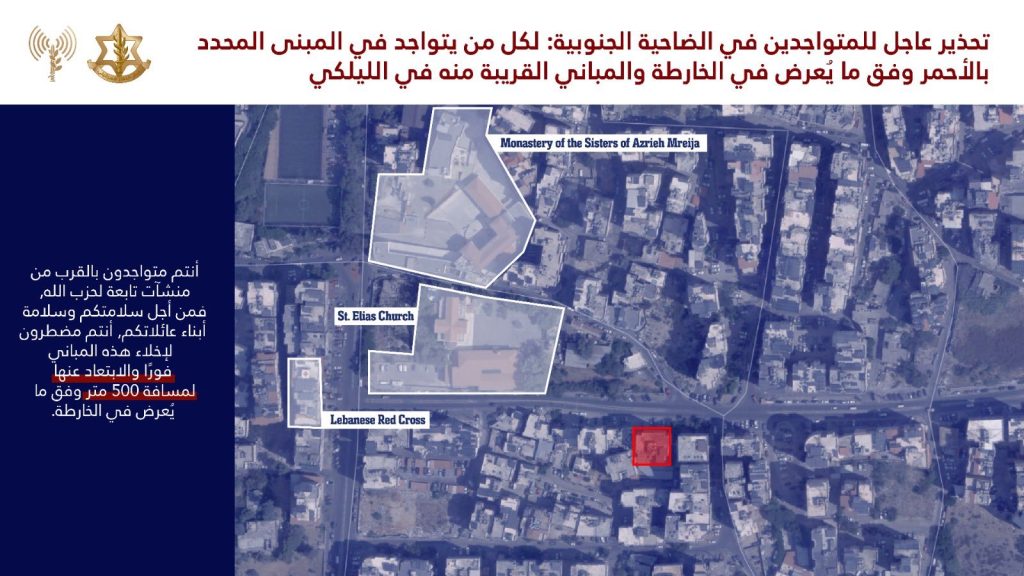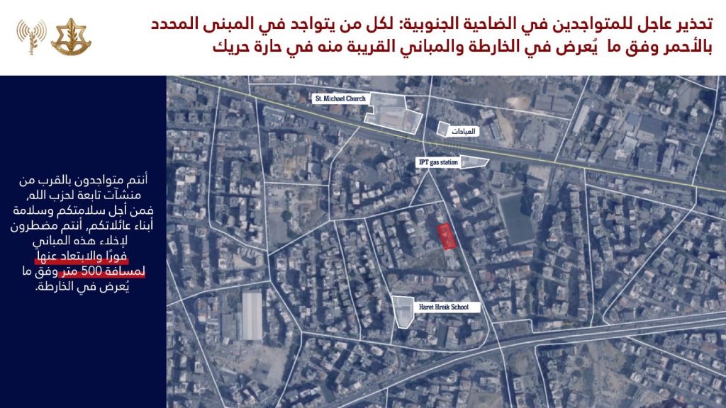 عاجل 2/3 إلى جميع السكان المتواجدين في منطقة الضاحية الجنوبية وتحديدًا في المباني المحددة في الخرائط المرفقة والمباني المجاورة لها في المناطق: