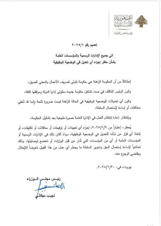 اخبار محليةعلى مدار الساعة بالصورة تعميم بشأن حظر إجراء أيّ تعديل في الوضعيّة الوظيفيّة يناير 20, 2025 0 215 FacebookTwitterWhatsApp صدر عن رئيس حكومة تصريف الأعمال نجيب ميقاتي، تعميم إلى كلّ الإدارات الرسمية والمؤسسات العامة بشأن حظر إجراء أيّ تعديل في الوضعيّة الوظيفيّة.