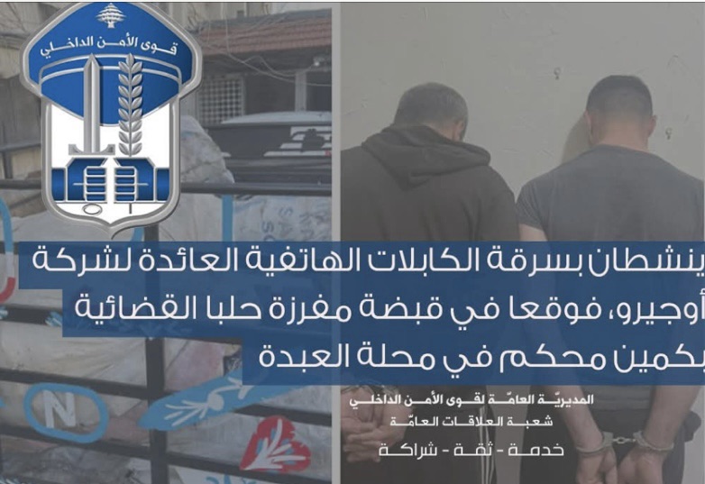 في إطار المتابعة المستمرّة التي تقوم بها قطعات قوى الأمن الدّاخلي لمكافحة عمليّات السّرقة، ولاسيّما سرقة الكابلات العائدة لشركة أوجيرو، وملاحقة المتورّطين بها وتوقيفهم.