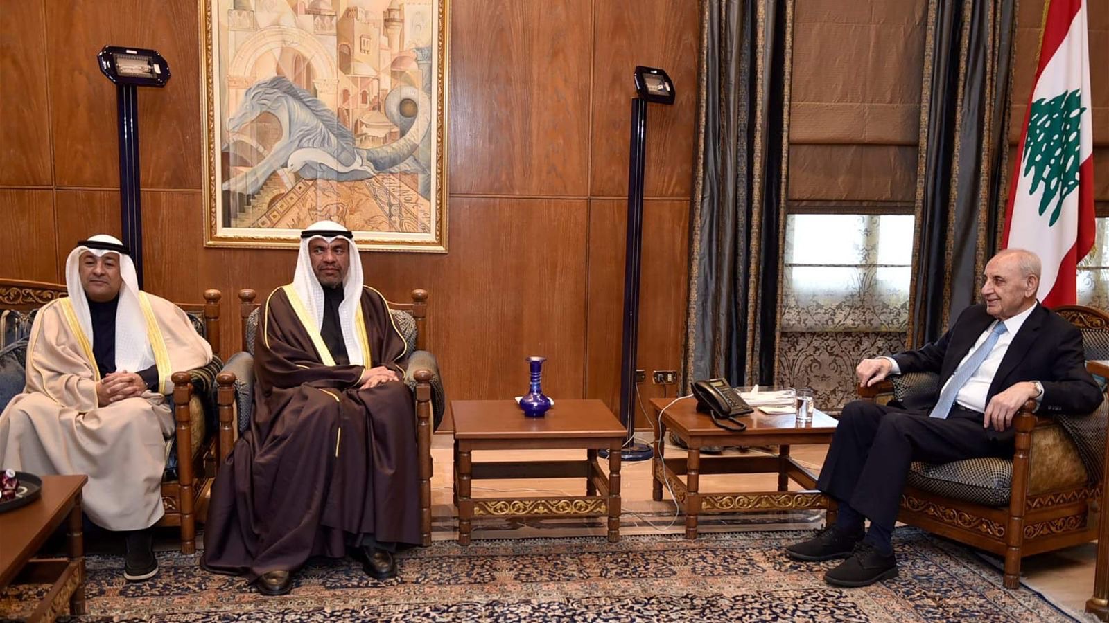 إستقبل رئيس مجلس النواب نبيه بري في مقر الرئاسة الثانية في عين التينة رئيس الدورة الحالية للمجلس الوزاري لمجلس التعاون لدول الخليج العربية وزير الخارجية الكويتي عبد الله علي اليحيا والأمين العام لمجلس التعاون لدول الخليج العربية جاسم محمد البديوي والوفد المرافق بحضور المستشار الإعلامي لرئيس مجلس النواب علي حمدان ، حيث جرى عرض للأوضاع العامة في لبنان والمنطقة والمرحلة الدقيقة التي تمر بها ، وأهمية أن ينحو لبنان نحو مسار إستعادة دوره وإستقراره وإزدهاره .