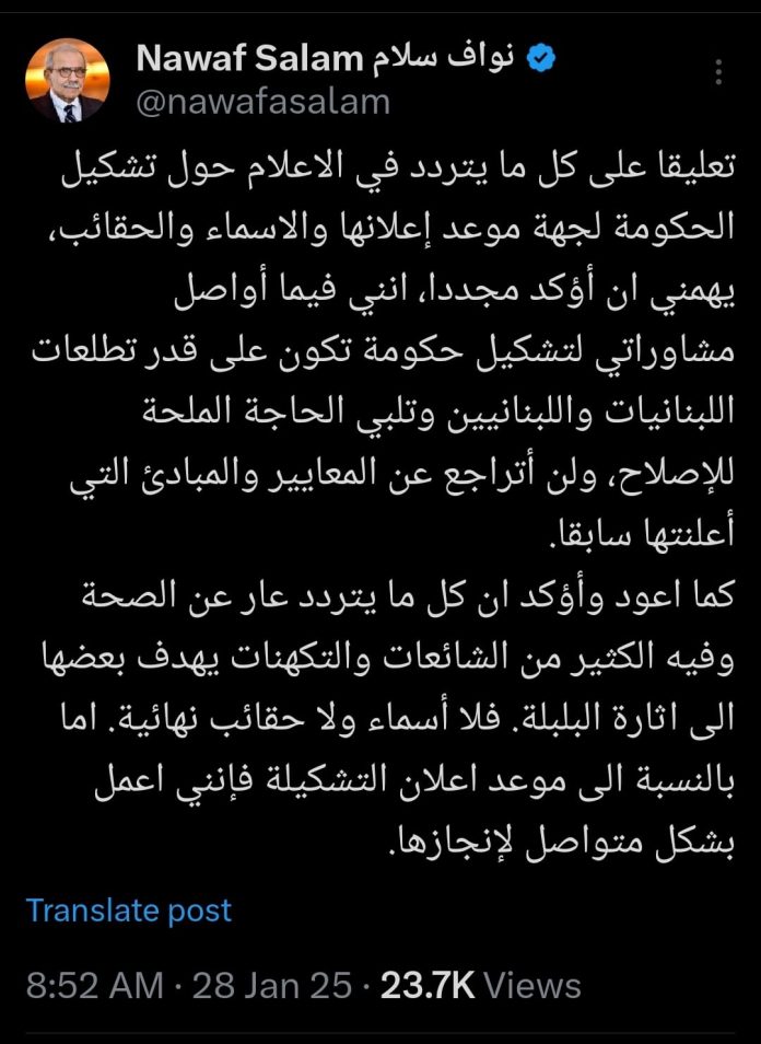 فقد علّق الرئيس سلام على كلّ ما يتردّد في الإعلام حول تشكيلِ الحكومة، لجهة موعد إعلانها والأسماء والحقائب، وكتب: “يهمُّني أن أؤكدَ مجدّدًا، أنّني فيما أواصل مشاوراتي لتشكيلِ حكومةٍ تكون على قدر تطلّعاتِ اللّبنانياتِ واللبنانيّين وتلبّي الحاجة الملحّة للإصلاح، لا أزالُ متمسِّكًا بالمعاييرِ والمبادِئ التي أعلنتُها سابقًا”.