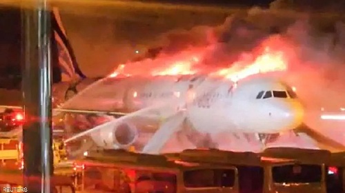 وأظهرت صور ألسنة لهب ترتفع لعدة أمتار من سقف الطائرة.