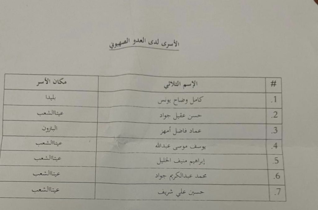 حصلت الـ LBCI على اللائحة التي زود بها حزب الله السلطات اللبنانية والتي تضم أسماء ٧ أسرى وهم كامل يونس أسر في بليدا،حسن جواد، يوسف عبدالله، إبراهيم الخليل، محمد جواد، حسين شريف.